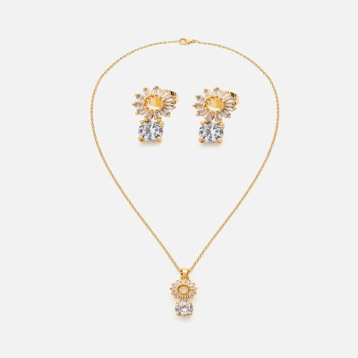 - يتميز الطقم بتصميمه الأنيق بحليه بشكل دائري تتدلى منها حجر زركون مربع تتزين بفصوص من الزركون اللامع