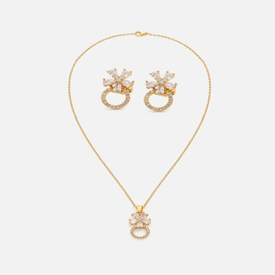 - يتميز الطقم بتصميمه الأنيق بحليه مفرغة بشكل دائري تتزين بفصوص من الزركون اللامع وتتزين بحلية بشكل وردة
