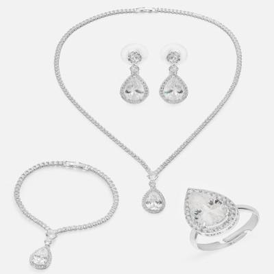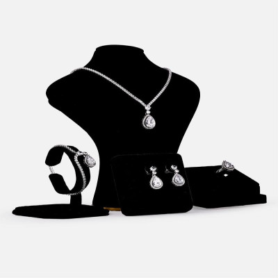 • يتميز الطقم بتصميمه الذي يتزين بحليه بشكل دمعة تتزين بفصوص من الزركون اللامع