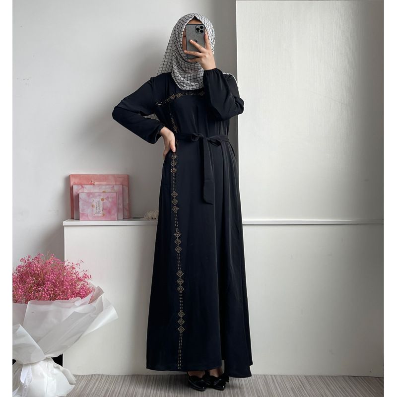 اللون والتطريز: العباية سوداء وتحمل تطريزًا ذهبيًا رائعًا على طول الجزء الأمامي وعلى حواف الأكمام. هذا التطريز يضفي لمسة من الفخامة والجمال.