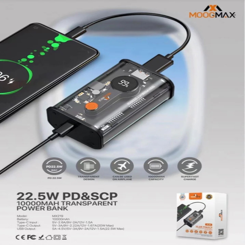 بطارية من موج ماكس بتصميم شفاف عصري، وبقوة 10000 مللي أمبير، تمتاز بتصميمها الصغير والرائع لتوفر لك شحن آمن وفعال.